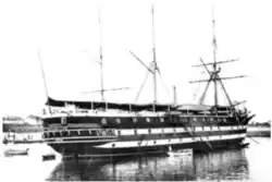 A decree of 10 September 1869 established the Colegio Naval Militar (Naval Military College), and in 1870 Asturias entered the Arsenal de Ferrol at Ferrol, Spain, to undergo conversion into the college's headquarters as an immobile cadet training ship.[1] Her propulsion plant and most of her rigging and guns were removed and. among other things, her accommodations were expanded to house officer cadets. she retained her three masts and some of their yards. She emerged from the conversion with a reduced displacement of 1,576 tons and her hull painted black with two stripes, giving her the appearance of a two-deck ship,[1] although as a frigate she had only one gun deck.