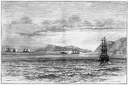 On 10 October 1873,[20] the central government squadron arrived off Cartagena to establish a blockade. During the evening of 10 October, Lobo kept his ships just outside Cartagena's harbor off of Escombreras, an islet at the mouth of the harbor.[20] Later, during the night of 10–11 October, he ordered his ships to raise sail, probably to economize on their use of coal, and a strong north wind blew his squadron offshore and eastward to a position east of Portmán, Spain.[20]
