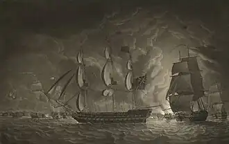 By the terms of the Third Treaty of San Ildefonso of October 1800, Spain agreed to supply France with "six ships of war in good condition built for seventy-four guns, armed and equipped and ready to receive French crews and supplies". The San Antonio was handed over in May 1801 to become the French ship Saint Antoine under Commodore Julien Le Ray, though some Spanish seamen remained aboard. Taking part in the Second Battle of Algeciras during the night of 12–13 July 1801, she was pursued by HMS Superb, Captain Keats, the combined French and Spanish crew engaging the British vessel as it approached.[1] At 23:50 on the 12th, Keats laid his ship close alongside the new French ship, beginning a close and heated action as the ships of the line exchanged broadsides with one another in pitch darkness and with an increasing wind.[2] For thirty minutes the battle continued until, with the ships off Cape Spartel in North Africa, a wounded Le Ray decided that his ship was no longer able to contest the action and hailed Superb to announce that he had surrendered. The halyards that held up his pennant had however become tangled in the rigging, giving the appearance that the ship was still in French hands: this later led Saint Antoine to be attacked repeatedly by other British ships as they came up during the night.[3] Keats remained with his prize, awaiting the arrival of the rest of the squadron: Caesar, Venerable, Spencer and Thames arrived after midnight, all firing on Saint Antoine as they passed before continuing westwards in search of other enemy vessels.