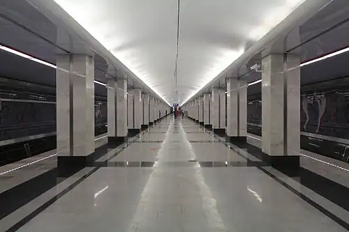 Spartak (Russian: Спартак), previously named Volokolamskaya (Russian: Волоколамская), is a station on the Moscow Metro's Tagansko-Krasnopresnenskaya line, under the former Tushino airfield. It was originally constructed in 1975 as part of the northern extension of the Krasnopresnensky radius but was left unfinished for nearly 40 years. The planned opening of Otkrytiye Arena Stadium, the home ground of FC Spartak Moscow, at the site drove the completion of the station, which opened on 27 August 2014.[1] Consequently, the station's name was changed from the planned Volokolamskaya to Spartak, and the stadium was opened on 5 September of the same year.