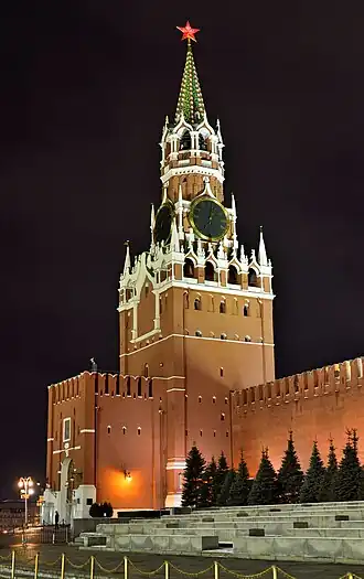 The Spasskaya Tower (Russian: Спасская башня, romanized: Spasskaya bashnya), also translated as the Saviour Tower, is the main tower on the eastern wall of the Moscow Kremlin which overlooks Red Square.