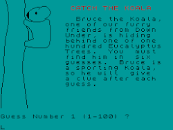 In Spectrum Safari, the players have to take a party of stranded explorers across an island infested with highly intelligent wildlife with university degrees, and beset with natives who want to barter away their food and men to replace that eaten by the men or the intelligent wildlife. Once they have visited a village it disappears forever, but it teaches a caution in the bargaining, if the players get short of explorers (lives) in the party. Losing them all means death to the player. The main object is to find the only boat, buy it and sail away from this Magnus Magnusson madhouse. Every animal encountered has some problem; sometimes it is an arcade style situation, sometimes they want to know the answer to a difficult mathematical problem. If the players fail a member their party gets eaten.[2]