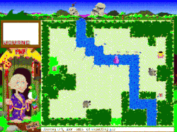 The objective of Spelling Jungle is to paddle a raft up the river and stop the flooding at its source. The player must make frequent stops in their journey and complete puzzles, where letter tiles have to be walked over to spell out a certain word. The player must also avoid enemies like lions, alligators, or demons, in order to advance further up the river. The game features 101 levels total that become more difficult and complex as the player ventures further upriver.[7]