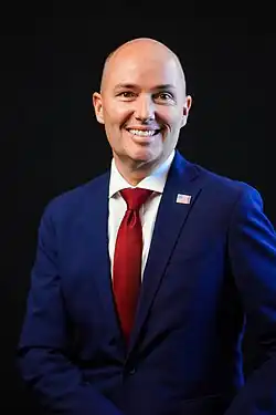 Spencer James Cox (born July 11, 1975) is an American lawyer and politician serving since 2021 as the 18th governor of Utah. A member of the Republican Party, he served from 2013 to 2021 as the eighth lieutenant governor of Utah. In Fairview, Utah, where Cox lives and was raised, he was elected to the city council in 2004 and then as mayor in 2005. In 2008, he was elected as a Sanpete County commissioner.[1]