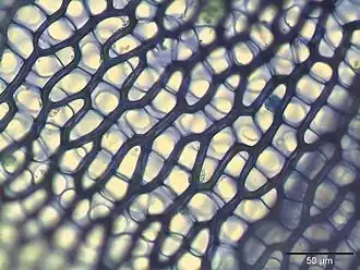 Branch leaves measure 1.1–2.2 mm in length and are arranged irregularly around the branches rather than in distinct rows.[7] Each leaf has a lance-like shape with slightly curved edges and an inrolled tip (involute apex).[8] The leaves' cellular structure shows regular patterns of strengthening fibers and has many small holes (pores) where cells meet (commissures).[2] The pores show a distinctive pattern: on the convex surface, they grade from small near the leaf apex to large at the base, while the concave surface features large round pores at the leaf apex and along the margins.[8] They contain specialised cells for water storage (hyaline cells) that vary in size, being smaller near the tip (60–90 by 15–20 μm) and larger towards the base (up to 170 by 30–40 μm).[7]