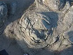 Spheroidal weathering is a form of chemical weathering that affects jointed bedrock and results in the formation of concentric or spherical layers of highly decayed rock within weathered bedrock that is known as saprolite. When saprolite is exposed by physical erosion, these concentric layers peel (spall) off as concentric shells much like the layers of a peeled onion. Within saprolite, spheroidal weathering often creates rounded boulders, known as corestones or woolsack, of relatively unweathered rock. Spheroidal weathering is also called onion skin weathering, concentric weathering, spherical weathering, or woolsack weathering.[1][2][3][4]