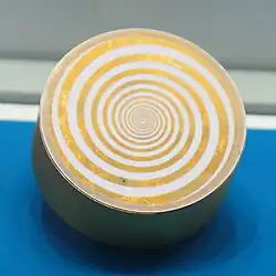 A spiral antenna is a type of radio frequency antenna shaped as a spiral,[1]: 14‑2 first described in 1956.[2] Archimedean spiral antennas are the most popular, while logarithmic spiral antennas are independent of frequency:[3] the driving point impedance, radiation pattern and polarization of such antennas remain unchanged over a large bandwidth.[4] Spiral antennas are inherently circularly polarized with low gain; antenna arrays can be used to increase the gain. Spiral antennas are reduced in size with its windings making it an extremely small structure. Lossy cavities[5] are usually placed at the back to eliminate back lobes, because a unidirectional pattern is usually preferred in such antennas. Spiral antennas are classified into different configurations: Archimedean spiral, logarithmic spiral, square spiral, etc.
