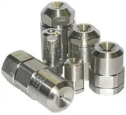 All spray dryers use some type of atomizer or spray nozzle to disperse the liquid or slurry into a controlled drop size spray. The most common of these are rotary disk and single-fluid high pressure swirl nozzles. Atomizer wheels are known to provide broader particle size distribution, but both methods allow for consistent distribution of particle size.[3] Alternatively, for some applications two-fluid or ultrasonic nozzles are used. Depending on the process requirements, drop sizes from 10 to 500 μm can be achieved with the appropriate choices. The most common applications are in the 100 to 200 μm diameter range. The dry powder is often free-flowing.[4]