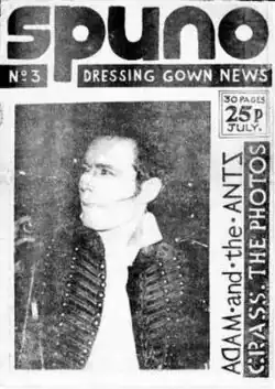 Spuno was a punk fanzine, bizarrely subtitled Dressing Gown News after a song by local band Identity Crisis,[1] based in Bath, UK. Edited and produced by Mark Price (AKA Eric Normal) & Marcus Pennington, it ran to 3 issues in 1980.[2] The Spuno logo was the music magazine Sounds logo upside down.