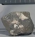 | 15418 | ![]() | breccia | A blocky, angular breccia with 5 to 10 percent leucocratic clasts bigger than 1 mm. Sizes are seriate with 10 to 20 percent leucocratic clasts in the range of 0.5 to 1.0 mm. The light- to medium-gray matrix is coherent and has a few percent spherical vesicles to 10 mm across, most of which are concentrated at one end of the specimen. |