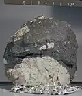 | 15455 | ![]() | breccia | A blocky, angular breccia with approximately 45 percent leucocratic clasts to 8 cm across. Sizes are bimodal with 1 percent leucocratic clasts less than 1 mm. The largest clast has very irregular embayed boundaries with the matrix and is cut by veins of matrix material that are irregular in course and width. This clast also has perhaps 25 percent 1- to 3-mm patches of light-gray material in chalky-white material. Smaller leucocratic clasts are concentrated in a band or pod. The dark-gray matrix is coherent and has a few percent vugs concentrated near one large clast. |