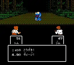 Players control Tom Sawyer and his friends as they join the party, such as Jim and Huck, and they each have RPG game statistics such as health, power, and speed.[2] Characters can choose to equip no weapons, and fight with their fists, but there are a large number of collectible items.[2] Key cards and black magic are also present in the game.[2] The game features an enemy that triggers the reset button on a players controller bringing them back to the title screen.[3]