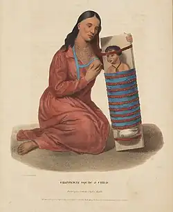 "The sketch exhibits a certain etiquette. The Squaw's station in travelling is at a considerable distance in the rear of her liege lord, and never at the side of him. [Walker] had the kindness to present the writer a dozen pair of moccasins worked by this squaw - richly embroidered on the instep with colored porcupine quills."[21][22][23]