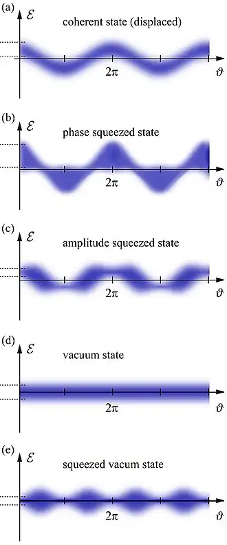 Fig. 1. shows five different quantum states that a monochromatic wave could be in. The difference of the five quantum states is given by different electric field excitations and by different distributions of the quantum uncertainty along the phase . For a displaced coherent state, the expectation (mean) value of the electric field shows an oscillation, with an uncertainty independent of the phase (a). Also the phase- (b) and amplitude-squeezed states (c) show an oscillation of the mean electric field, but here the uncertainty depends on phase and is squeezed for some phases. The vacuum state (d) is a special coherent state and is not squeezed. It has zero mean electric field for all phases and a phase-independent uncertainty. It has zero energy on average, i.e. zero photons, and is the ground state of the monochromatic wave we consider. Finally, a squeezed vacuum state has also a zero mean electric field but a phase-dependent uncertainty (e).