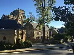 Soon after her death in 1903, a site was chosen for the Lane-Johnston Building, and the foundation stone was laid in June 1905. By 1907, construction was virtually complete on the new building, which housed everything—classrooms, the dining hall, the headmaster’s study, and a 40-bed dormitory—but the chapel: the Bishop of Washington repurposed an adjacent repository for cathedral furnishings into the Little Sanctuary, adding a bell tower and an archway.[5]