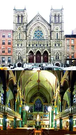 St. Bernard's Church was built from 1873 to 1875 to the designs of Patrick C. Keely and was the first church consecrated by an American Cardinal, Archbishop of New York John McCloskey.[1] Once considered one of the most important parishes in the city, the congregation at the time of erection consisted of mostly Irish immigrants and their descendants. Irish-born architect Patrick Charles Keely's design of "twin towers, triple-portal entrance, and rose window inset into a pointed arch reveal a masterful blending of French and English influences."[2] Also referenced as Ruskinian Gothic by the AIA Guide to NYC (2010)[3] The interior features a prominent U-shaped gallery and many figurative stained-glass windows in the style of Mayers of Munich. The church has at least one Tiffany window. Presumably since the 2003 merger, the interior has been significantly redecorated and painted with many of the transferable art objects of Our Lady of Guadalupe parish moved here. The reredos has been painted with many scenes of Our Lady of Guadalupe and the Blessed Juan Diego, and the modern Basilica of Our Lady of Guadalupe.