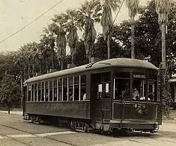 While the city's first experiments with electric-powered cars were made in 1884 (in conjunction with the World Cotton Centennial World's Fair), electric streetcars were not considered sufficiently developed for widespread use until the following decade, and the line was electrified February 1, 1893.[3] At the same time, it was extended from the corner of St. Charles and Carrollton Avenues to continue eight blocks out Carrollton to a new car barn at Willow Street.[6]