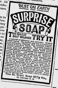 James Ganong died unexpectedly at the age of forty-seven and his son Edwin took over the running of the business. The St. Croix Soap Manufacturing Company was best known for its Surprise Soap that became a national brand which lasted until 1946. Advertising helped sell the company's products such as the innovative 1894 publishing of The Surprise Cook Book, a recipe collection by the then widely popular American writer Marion Harland. It was formally registered as The Premium Cook Book, the title used by the American Technical Book Company who published it in the United States. The book was reprinted in 1990 by the Atlantic-New England Heritage Committee. (ISBN 0969476906)
