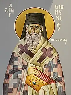Saint Dionysios of Zakynthos was a 16th-century Orthodox Christian Archbishop of Aegina. He was born on the Greek island of Zakynthos in 1547. He is the patron saint of Zakynthos (sometimes called Zante in English) and is celebrated on August 24 and December 17.[1]
