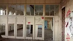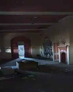 In November 2015, a fire, believed to have been left unattended by squatters, ignited the roof just before 4:00 p.m. It took approximately six hours to extinguish the fire, during which 80% of the roof was damaged. Much of the roof collapsed, exposing the timber frame skeleton, and some rooms were completely destroyed.[49][50] Moments before the building caught on fire, there were unconfirmed reports that a loud bang was heard.[41] The Goulburn Heritage Group stated that they were "upset and sickened" by the fire, and Ferrara responded by saying that he was disappointed, and that the building was not insured.[39][51][52] Ferrara has stated that he will try to preserve the building, and estimates the damage costs at $4 million to $5 million.[53] In 2016, another fire occurred in a building at the rear of the main structure, causing extensive damage. The building, which was revealed to be the old hall built in 1932, was deemed not salvageable; it was subsequently scheduled for demolition.[54][55] Following the fire, the council ordered Ferrara to secure both the site and loose building materials such as roof iron.[56] The fire was treated as suspicious, as witnesses claim that two people wearing backpacks were running from the building just before the fire occurred.[57] Following the second fire, a third fire occurred in the building, in which a large portion of the building was completely destroyed.[58]
