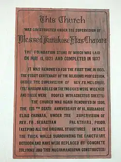 The church is an important pilgrimage center for followers of Saint Kuriakose Elias Chavara. The church was commissioned by him on 11 May 1831 and completed in 1837. It was subsequently renovated in 1955 and 1996. The church compound also houses the residential unit used by the saint. In 2014, when Fr. Kuriakose Elias Chavara was canonized as a saint, 60,000 people attended the thanksgiving mass at the church complex which was celebrated by 100 priests.[2]