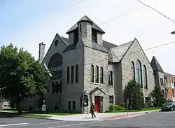 The Romanesque Revival structure was built from 1888 to 1889 for St. Paul's Presbyterian Church by S.R. Badgley, architect.[1] It originally had a large steeple. Unfortunately the church was built on sand, and the steeple side started sinking into the ground. The steeple was therefore removed early in the 20th century, leaving the building as a relatively squat stone structure.