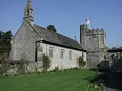 It has been suggested that the church may be of Saxon origin.[9] It has a Norman doorway and windows, but was largely rebuilt in later centuries. In the chancel are two ancient stone coffin lids, each bearing an inscription in Norman French, one to Urien de St Pierre, lord of the manor, who died in 1239 and the other to a contemporary cleric of the church, Rector Benet.[10] There are also numerous wall-mounted monuments to members of the Lewis family.[11]