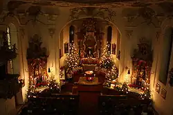 It is assumed that he based the interior design on the Buxheim parish church, which was decorated by the Zimmermann brothers. The three altars (high altar, Lady altar and Joseph altar) and the pulpit were created under the influence of Gabriel Weiß the Elder from Bad Wurzach and his son of the same name. The sculptors and carvers probably belonged to the circle of Anton Sturm from Füssen[11] and Dominikus Hermengild Herberger, a native of Upper Swabia.[12] The name of the fresco painter has not been handed down. The church was renovated for the first time in the 19th century. In 1922 the room shell and the frescoes were repaired. The large ceiling fresco, which was painted over during the first renovation, was renewed by Josef Albrecht. At about the same time, the door leading from the nave to the tower was bricked up and the entrance from the sacristy to the lower part of the tower was created. In 1949 the altars, the pulpit and the figures received new settings. The last comprehensive restoration took place from 1989 to 1997. During this time, the entire church was renovated and the choir was equipped with a new popular altar by Jörg Maxzin. In 2009, the retaining wall with the staircase, east of the church, had to be renovated at a cost of 135,000 euros, as its stability was no longer guaranteed.