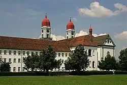 During the Helvetic Republic (1798-1803) the Abbey was placed under secular management and became the center of its own municipality. In 1814 the Abbey was assigned to the municipality of Pfaffnau. The last abbot, Friedrich Pfluger, initiated a series of reforms. However, shortly after his death in April 1848, the Abbey was secularized by the liberal cantonal government. The property, church treasure and choir pews were sold. The Abbey library was transferred to the cantonal archive and library. The monastery buildings changed hands several times after 1853. In 1859 the Basel silk industrialist Johann Jacob Richter-Linder bought the Abbey and converted it into a silk factory. In 1870, the Canton of Lucerne, bought the building complex back and established a psychiatric hospital there. This hospital opened in 1873 and remained in the Abbey until a new hospital was built in 1977-87. The village of Sankt Urban grew up around the hospital in the 1930s to provide housing for the hospital staff. Portions of the Abbey are now used for cultural purposes such as concerts or tours.[2]