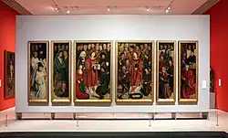 The original retable, during its stay in the Cathedral of Lisbon, contained "over twelve" panels, as a source from 1767 states.[1] They were displayed in the cathedral at least until 1690 and were set aside in the cathedral until 1742. They were then transferred to the palace of Mitra, where they escaped the devastating earthquake of Lisbon in 1755.