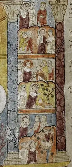 More unusually, twelve small scenes drawn from Luke, mostly of the Works of Christ (who can be identified as the only figure with a halo), are set between columns in the architectural frame to the portrait. This particular arrangement is unique in surviving early evangelist portraits, though similar strips of scenes are found in ivory book-covers from the same period.[24] The scenes themselves probably drew from a now-destroyed fresco cycle of the Life of Christ in Santa Maria Antiqua in Rome.[25]