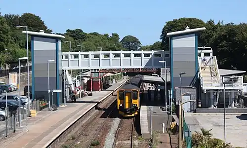St Austell railway station was opened by the Cornwall Railway on 4 May 1859 on the hillside above the town centre. Two branch lines west of the town were later opened to serve the china clay industry; the Newquay and Cornwall Junction Railway which is still partly open, and the short-lived Trenance Valley line.[35] The independent narrow gauge Pentewan Railway ran from West Hill to the coast at Pentewan. The Cornish Main Line in St Austell is quite renowned for its viaducts in the Gover Valley and Trenance areas of the town. The original timber structure was designed by Isambard Kingdom Brunel, it was 115 feet (35 m) high, 720 feet (220 m) long on 10 piers; it was replaced by a stone viaduct in 1899.[36][37]