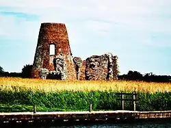 ![]() St Benet's Abbey and wharf from the River Bure, in front of a ruined windmill | |