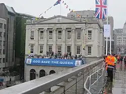 Depictions of St Magnus after the building of the new bridge, seen behind Fresh Wharf and the new London Bridge Wharf, include paintings by W. Fenoulhet in 1841 and by Charles Ginner in 1913.[171] This prospect was affected in 1924 by the building of Adelaide House to a design by John James Burnet,[172] The Times commenting that "the new 'architectural Matterhorn' ... conceals all but the tip of the church spire".[173] There was, however, an excellent view of the church for a few years between the demolition of Adelaide Buildings and the erection of its replacement.[174] Adelaide House is now listed.[175] Regis House, on the site of the abandoned King William Street terminus of the City & South London Railway (subsequently the Northern Line),[176] and the Steam Packet Inn, on the corner of Lower Thames Street and Fish Street Hill,[177] were developed in 1931.[178]