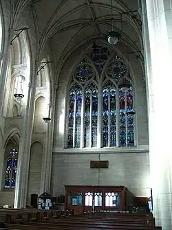 On 8 June 1915, the foundation stone of the new cathedral was laid. Huge foundations, large piers and a tremendous vaulted ceiling, the only one in stone in New Zealand, rose from the ground, forming the new cathedral's nave. Lack of finances, however, precluded construction of anything more. There was no money for the crossing or the chancel as originally intended. In the end it was resolved that a temporary chancel should be constructed using material saved from the old St Paul's. The new cathedral was consecrated by Nevill on 12 February 1919.[2]