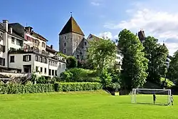 Breny house and Breny tower are part of the remains of the northeastern town walls of the medieval city of Rapperswil. The buildings date back to early 13th century AD, when the lords of Russikon (Russinger) built a residential tower respectively a small castle as servants (Ministerials) of the Counts of Rapperswil. In its present form, it was built in 1492 by the knight Hans of Landenberg from the Töss Valley replacing the former seat of the lords of Russikon. The Landenberg family officiated in Rapperswil as mayors and councils to 1530. Subsequent occupants were from 1530 to 1660 the Göldlin family, then the Good family, and from 1758 the Breny family. The former castle with its 28 metres (92 ft) high residential tower at the so-called Herrenberg ("castle hill") marked in the 16th century the urban expansion of the Middle Ages city to the northeast. The buildings were part of the northeasterly town walls at the bay of Kempraten on Lake Zürich shore heading to the so-called Herrenbergtor gate (broken in 1848).[1]