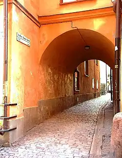 - Interior of the blind alley facing Köpmangatan.