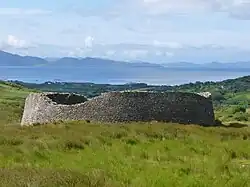 It is at the head of a valley opening south to the sea, surrounded by a ditch over 8m wide and at present 1.8m deep.[2] The fort's walls are up to 5.5 m (18 ft) high in places, 4 m (13 ft) thick at the bottom and 27.4 m (90 ft) in diameter.[3] The inside is reached through a 1.8m passage roofed with massive double lintels.[4] Staigue represents a considerable feat in engineering and building. It was built without mortar, using undressed stones of local sandstone.[1][5] Vertical joints visible in the wall show that gaps were left during the building of the wall to allow access and were filled in later. There is also a tapered, lintelled doorway. Inside is an elaborate network of stairways leading to terraces and corbelled cells in the wall reached by passages.[2]