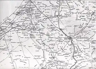 The 30-mile (48 km)-long Ottoman front line stretched southeastwards from Gaza and dominated the country to the southwest, where the EEF was spread out in open, low-lying, rugged country interrupted by many deep wadis.[24] From Gaza to Beersheba, this front line "stretch[ed] continuously for almost fifty kilometres."[19] Major defensive outposts along the line, such as Rijm el Atawineh and Aba Hareira, could support each other; and, as they overlooked an almost flat plain, making a frontal attack against them virtually impossible.[25] Between Gaza and Aba Hareira, at the Wadi el Sheria and halfway to Beersheba, the Ottoman defences were especially strong. Although those strengthened defences did not extend to Beersheba, strong fortifications, some being blasted from solid rock, made the isolated town a fortress.[26]
