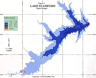 Construction for Lake Stamford and Stamford Dam started July 14, 1951, and was completed in March 1953. Deliberate impoundment began in June 1953. Stamford Dam impounds Paint Creek, but numerous other creeks flow into the lake. Horse, Buffalo, and Mule Creeks all flow directly into the lake and are part of the watershed. The design engineer for the project was Freese and Nichols and the general contractor was L. & S. Contractor. The dam is an earthfill embankment 3,600 feet (1,100 m) long with a maximum height of 78 feet (24 m). The estimated cost of the dam was $289,365.00. The top of Stamford Dam is at an elevation of 1,434.0 feet (437.1 m) and is 15.2 feet (4.6 m) above the spillway. The service spillway is 900 feet (270 m) north of the dam, where the uncontrolled spillway crest is 100 feet (30 m) in length at an elevation of 1,416.8 feet (431.8 m).[2] Lake Stamford is considered "full" (maximum desired capacity) when the lake's water level is 1,416.8 feet (431.8 m) above mean sea level.
