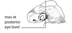 | O. Maxillary process of the mandibular arch (G01). | O2. Maxillary process posterior to eye (G01b). | The maxillary process lies posterior to the eye for a long period. First, when a clear rostrad development of the maxillary process is recognizable, its position at the level of the posterior margin of the optic cup should be noted. For identifying the level of the maxillary process in respect to the eye the ventral border of the telencephalic/diencephalic head region must be orientated horizontally. | [1] | ![]()  |