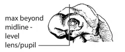 | P. Mandibular process (G02). | P3. Mandibular arch bud posterior lens (G02c). | The tip of the mandibular process is situated around the level of the posterior margins of scleral papillae, lens, iris and pupil. | [1] | ![]()  |