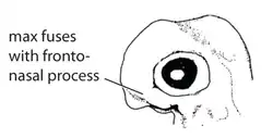 | O. Maxillary process of the mandibular arch (G01). | O6. Maxillary process fuses with frontonasal process (G01f). | The maxillary process fuses with the frontonasal process and both form a more or less consistent upper jaw. | [1] | ![]()  |