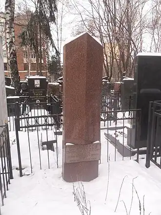 He was promoted to Colonel in 1949,[4] retired to the reserve in 1954 and died in Moscow, where he is buried in Section 29 of the Vvedenskoye Cemetery. On 20 November 1990 he was one of five spies featured on a set of stamps designed by B. Ilyukhin for the USSR's postal service - the others were Kim Philby, Konon Molody, Rudolf Abel and Ivan Kudrya.[5]
