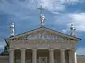 Between 1786 and 1792 three sculptures by Kazimierz Jelski were placed on the roof of Vilnius Cathedral: Saint Casimir on the south side, Saint Stanislaus on the north, and Saint Helena in the centre. These sculptures were removed in 1950 by the Soviet powers and restored by Stanislovas Kuzma in 1997.[9][10] Presumably, the sculpture of Saint Casimir originally symbolized Lithuania, that of Saint Stanislaus symbolized Poland, and that of Saint Helena holding a golden cross 9 metres high represents the true cross.