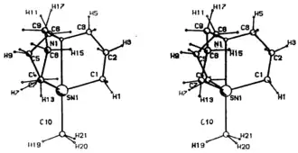 - ^ Jurkschat, K.; Tszchach, A.; Meunier-Piret, J. (1986). "Crystal and molecular structure of 1-AZA-5-STANNA-5-methyltricyclo[3.3.3.01,5]undecane. Evidence for a transannular donor−acceptor interaction in a tetraorganotin compound". Journal of Organometallic Chemistry. 315: 45–49. doi:10.1016/0022-328X(86)80409-0.