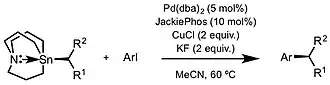 - ^ Li, Ling; Wang, Chao-Yuan; Huang, Rongcai; Biscoe, Mark R. (2013). "Stereoretentive Pd-catalysed Stille cross-coupling reactions of secondary alkyl azastannatranes and aryl halides". Nature Chemistry. 5 (7): 607–612. Bibcode:2013NatCh...5..607L. doi:10.1038/nchem.1652. PMC 8048766. PMID 23787752.