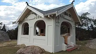 From Lock Street, the rest house is approached by several sets of concrete stairs on a path leading up the hill from the road. The rest house is set amongst exposed granite boulders on a flat site at the summit of the hill. There is a flagpole to the south and retaining walls and stairs to the south and west. Set on an east–west axis with views through arched openings including to the west, a panorama of Stanthorpe and the surrounding district, the rest house is a white painted concrete pavilion with a painted corrugated roof gabled in four directions. On the east and west gables in concrete raised lettering is the inscription "SOLDIERS' MEMORIAL"; on the north and south gables "1914–19".[3]