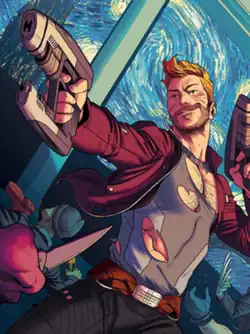 Peter decides to remain inactive for a time until he discovers his father was planning to pass a law that forbade any interaction of extraterrestrial or space origin with Earth. Knowing this would be an open invitation for invasion, Peter decides to reform the Guardians with six members: Gamora, Rocket Raccoon, Groot, Drax the Destroyer, and Bug, along with himself, and start protecting Earth from any attack. Soon they aid the Avengers against the returned Thanos.[46][47][48][49][50][51] After this, Star-Lord and his new team of Guardians engage in conflicts with the Badoon. He is soon captured by the army of Spartax but he escapes imprisonment and broadcasts a video showing the unfairness of his father's reign.[52][53][54][55] During the war of the builders, he infiltrated the S.W.O.R.D. facilities and rescued Abigail Brand along with Rocket and new member Angela.[56] He also declared war against the Shi'ar empire after intervening in one of their trials to rescue the kidnapped young Jean Grey along with the X-Men.