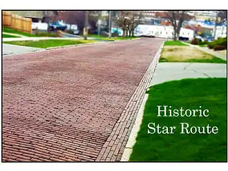 Part of the Red Brick Roads was a Star route. Star routes were affiliated with the United States Postal Service and were distinguished as old mail routes that were also commonly known as Highway Contract Routes for delivering mail. From the Northern Pacific Railroad depot, the red brick paving continued up to Star Route St. (now known as Maple St.) to Montgomery St. (today known as Campus St.) then east to the center of the college. Star Route was a very dusty and muddy horse and buggy road during the early 1900s. During the winter it was very difficult to travel and in 1906 a wooden sidewalk was constructed to aid foot traffic. On February 9, 1907 the Pullman Herald wrote concerning the safety of Star Route: "[It is] the most dangerous road in the county… there is an almost perpendicular drop off of 18-20 feet with the Northern Pacific Track lying beneath. If a team should run away on coming down Star Route it would in all probability dash over the yawning precipice and death would be inevitable".[7] The city and residents of Pullman saw paving as a solution to the dangers and inefficiencies of the unpaved dirt road.